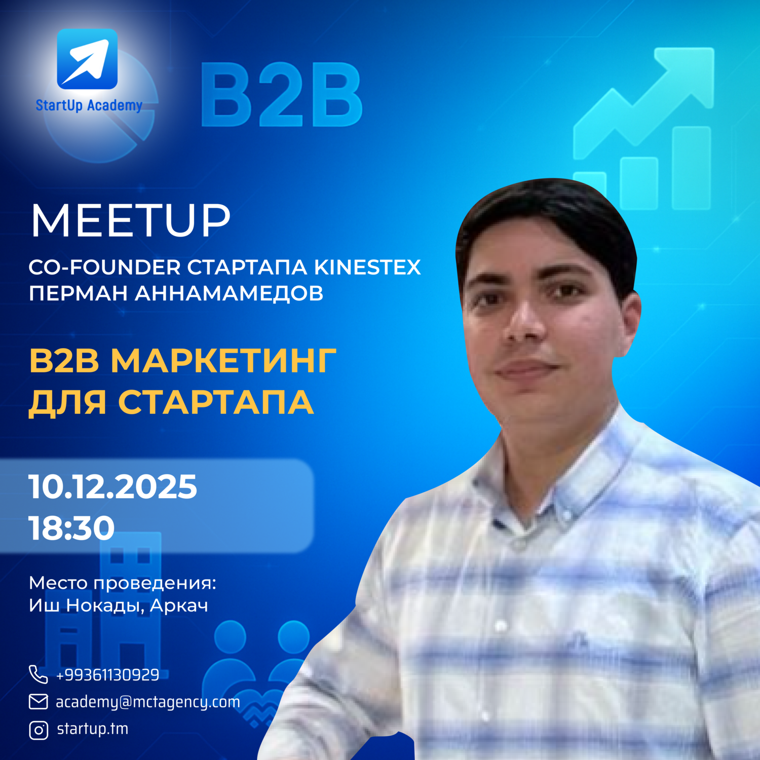 StartUp Academy приглашает всех представителей стартап-сообщества на практический митап «B2B маркетинг для стартапа» с участием со-основателя проекта Kinestex Пермана Аннамамедова. На встрече будут подробно разобраны стратегии привлечения корпоративных клиентов, построение устойчивой B2B-воронки и методы, которые помогают молодым командам выходить на рынок компаний и успешно конкурировать. Спикер поделится опытом развития собственного продукта, расскажет о типичных ошибках начинающих проектов, о том, как формировать ценностное предложение для бизнеса и какие каналы продвижения действительно работают в Центральной Азии. Участники смогут понять, как планировать B2B-маркетинг на ранних этапах, как тестировать гипотезы и как выстраивать продажи, даже если команда пока небольшая.