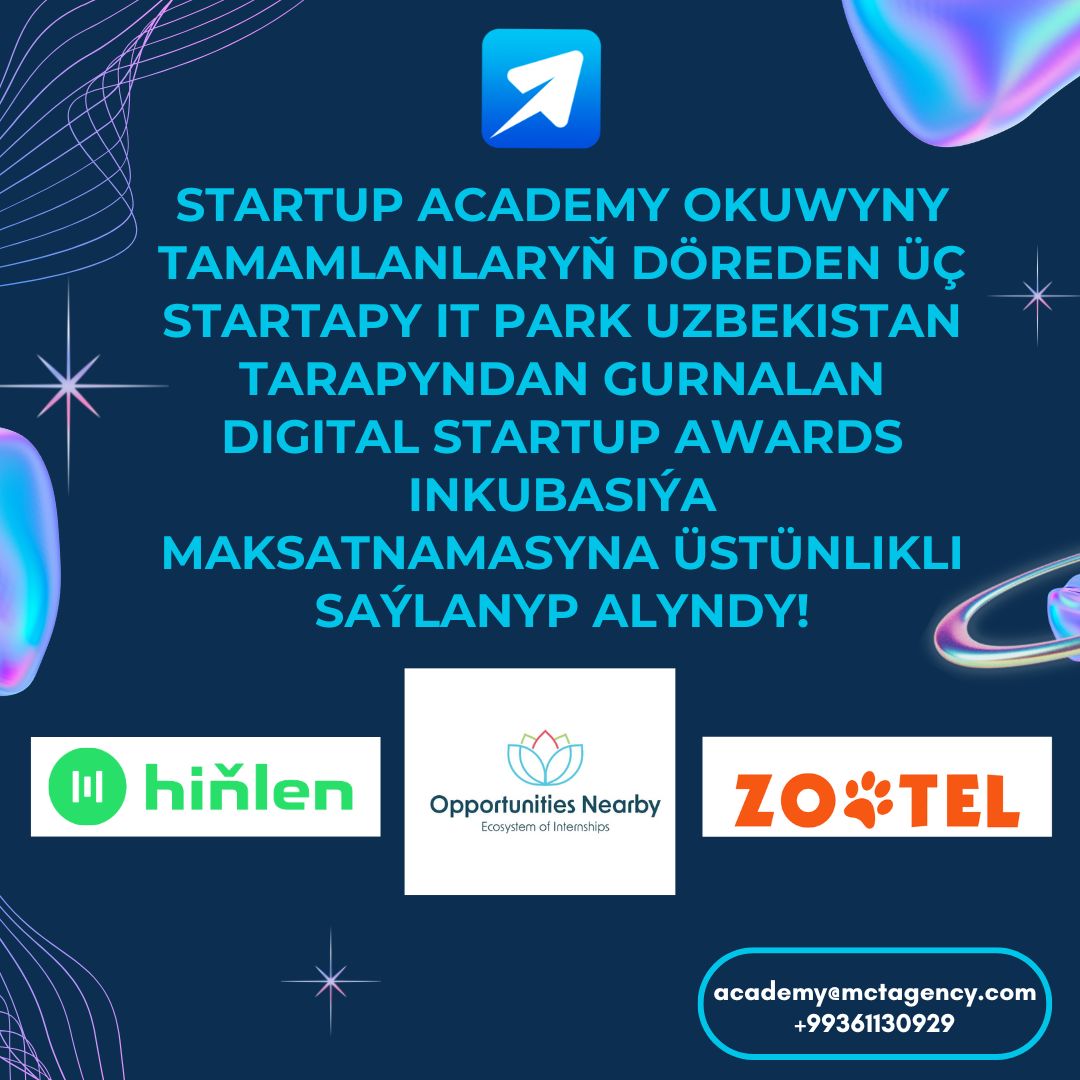 Startup Academy okuwyny tamamlanlaryň döreden üç startapy IT Park Uzbekistan tarapyndan gurnalan Digital Startup Awards inkubasiýa maksatnamasyna üstünlikli saýlanyp alyndy!